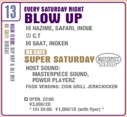 20歳の時ですね。実はそれまで、そんなにクラブ遊びをするタイプでもなかったんですけど、SUIさんの紹介で、当時HARLEMで毎週土曜日にBLOW UPというパーティーでMCをしていたC.Tさんに出会ったんです。そこで開口一番、「毎週来い」と言われて。そこからはもう、毎週欠かさず現場にいるっていう生活が始まりました。そこから知り合いもどんどん増えていきましたね。